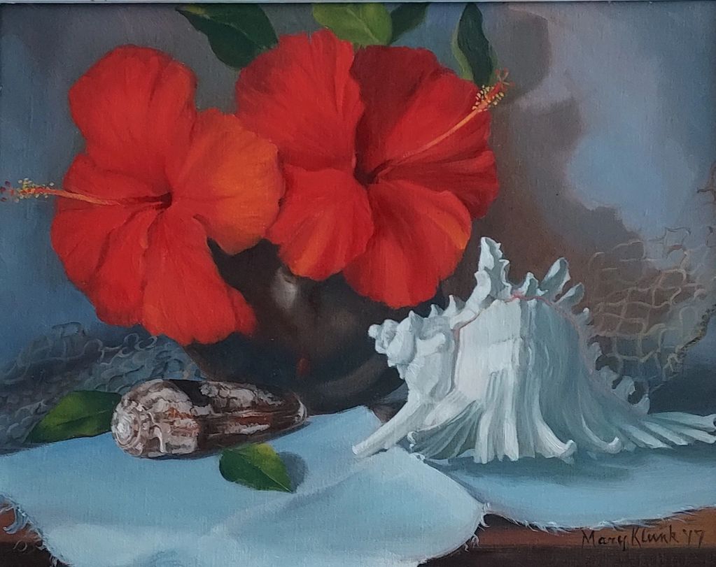 The vivid cadmium reds of the Hibiscus blooms appear in striking contrast to the cool colors in the background. The bright white of the shell offers a strong value contrast to the deep cadmium and alizarin crimson in the blooms. Hibiscus bloom almost year-round in Florida.